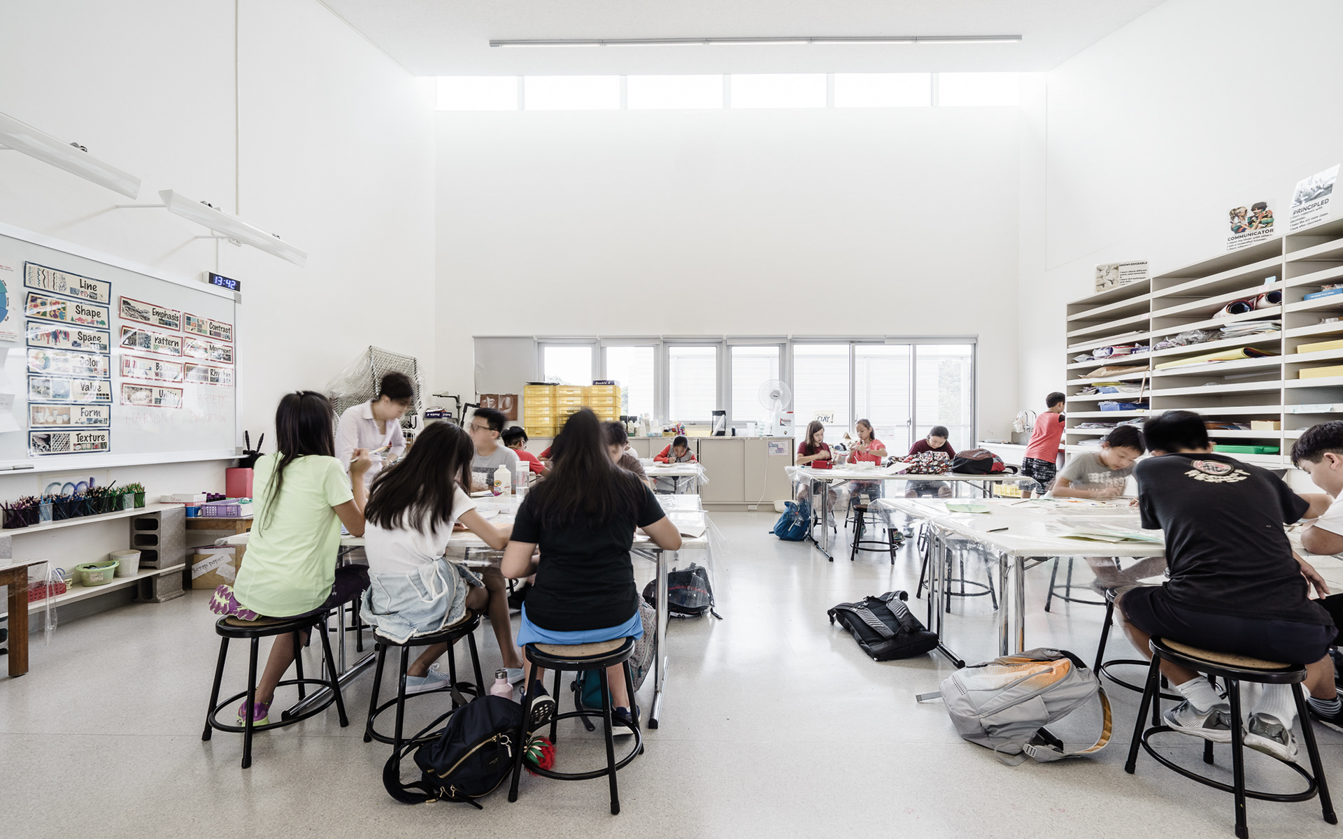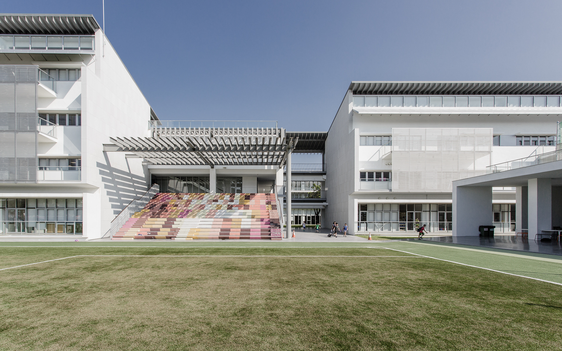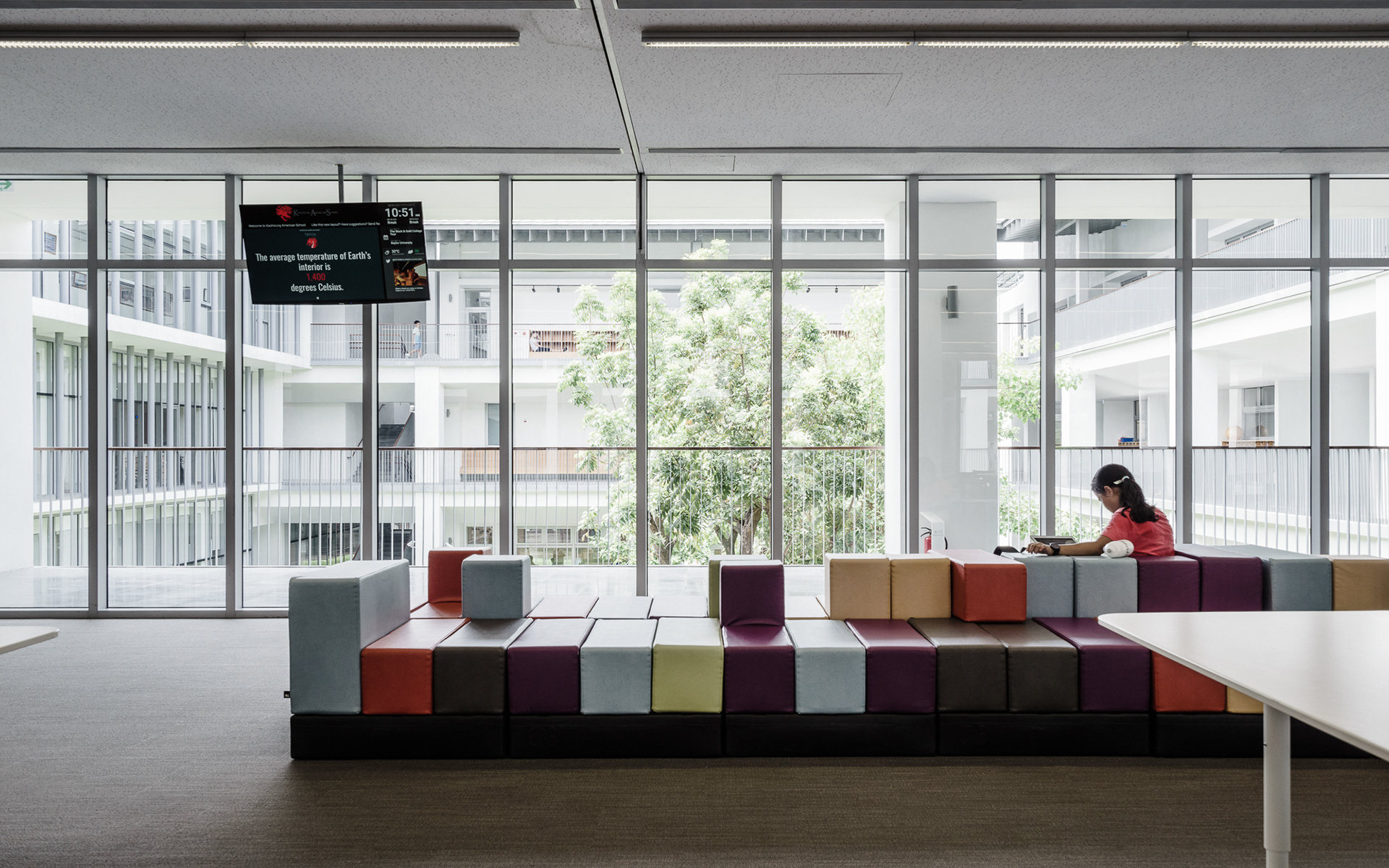 Uniting the two quads is the Learning Hub, a conglomerate of public core spaces including the exhibition hall, media center, the library, and the roof terrace. It is at the center of the school connected by the semi-open corridors, which generate a double-ringed circulation similar to the configuration of the infinity symbol. Thus, the Learning Hub can be accessed from all sides. Students can walk into the 1st floor exhibition hall through the corridors or access the roof terrace from the semi-open space in front of the 3rd floor library. Students coming back from the soccer field can walk up the grand stairway and pass through the media center before heading to classrooms. This arrangement enables the Learning Hub to be the influx of information as well as the influx of movement.