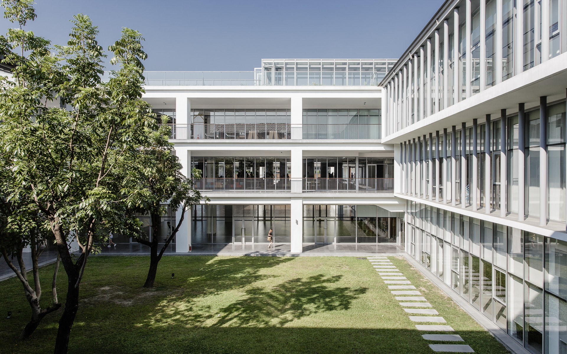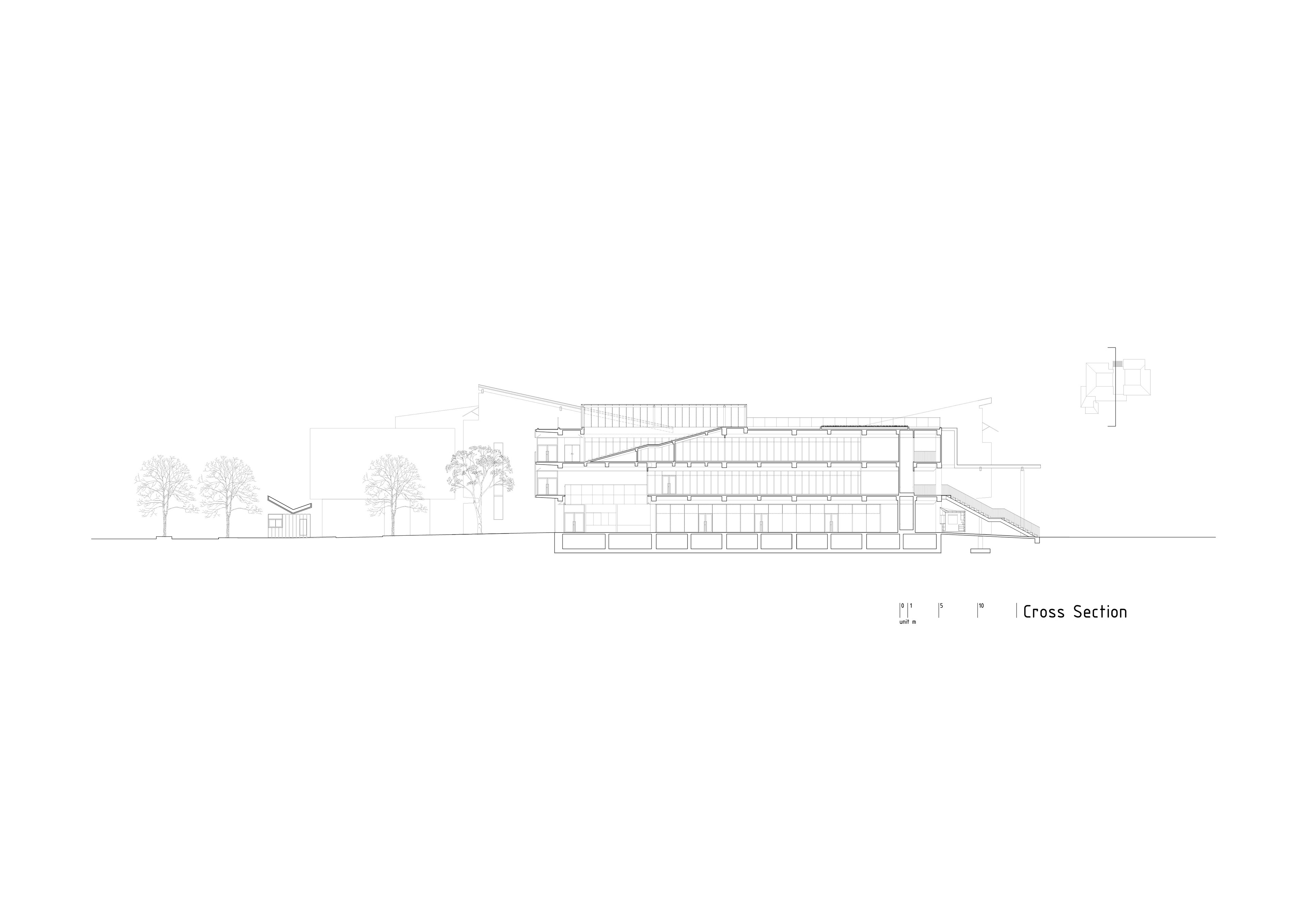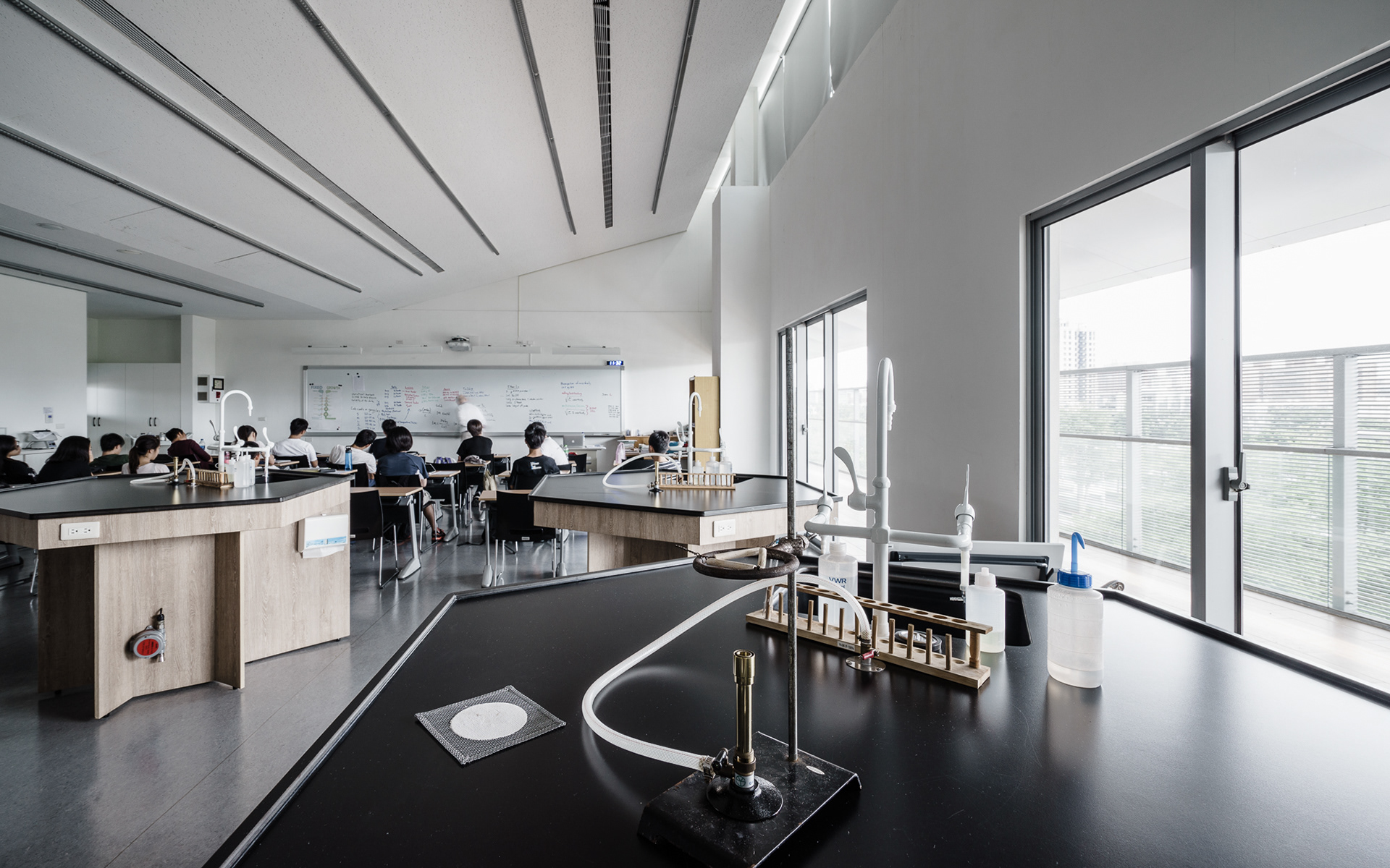 Uniting the two quads is the Learning Hub, a conglomerate of public core spaces including the exhibition hall, media center, the library, and the roof terrace. It is at the center of the school connected by the semi-open corridors, which generate a double-ringed circulation similar to the configuration of the infinity symbol. Thus, the Learning Hub can be accessed from all sides. Students can walk into the 1st floor exhibition hall through the corridors or access the roof terrace from the semi-open space in front of the 3rd floor library. Students coming back from the soccer field can walk up the grand stairway and pass through the media center before heading to classrooms. This arrangement enables the Learning Hub to be the influx of information as well as the influx of movement.