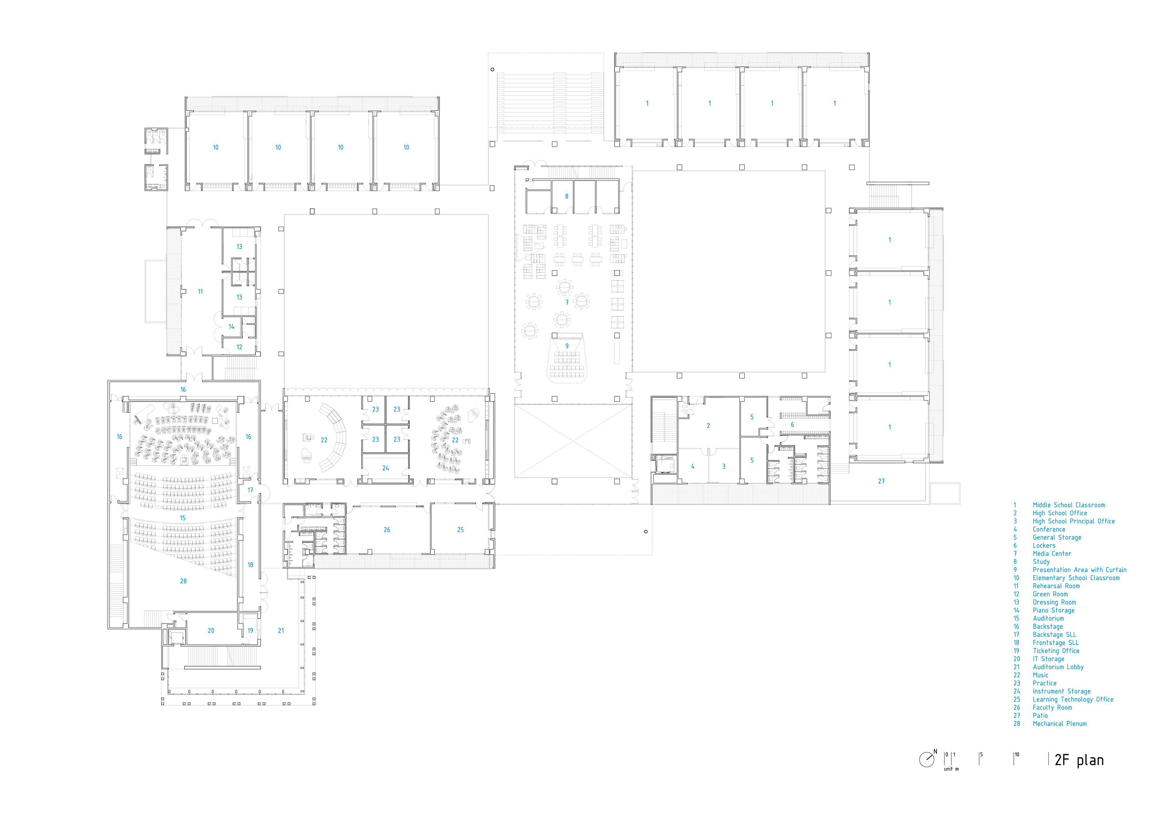The shoe box shaped auditorium can seat 400 people. When students need to rehearse, a large sliding door can be used to extend the back stage area to include the adjacent music classrooms. This also allows music classrooms to become auxiliary backstage spaces to support larger productions. The sound-absorbing curtains are recessed behind acoustic wood panels on both sides of the auditorium. For theater productions and lectures, these curtains can be closed to absorb sounds in order to provide clarity of the sound broadcasting from the stage. For concerts, these curtains can be opened to increase reverberation time in order to generate good sound quality.