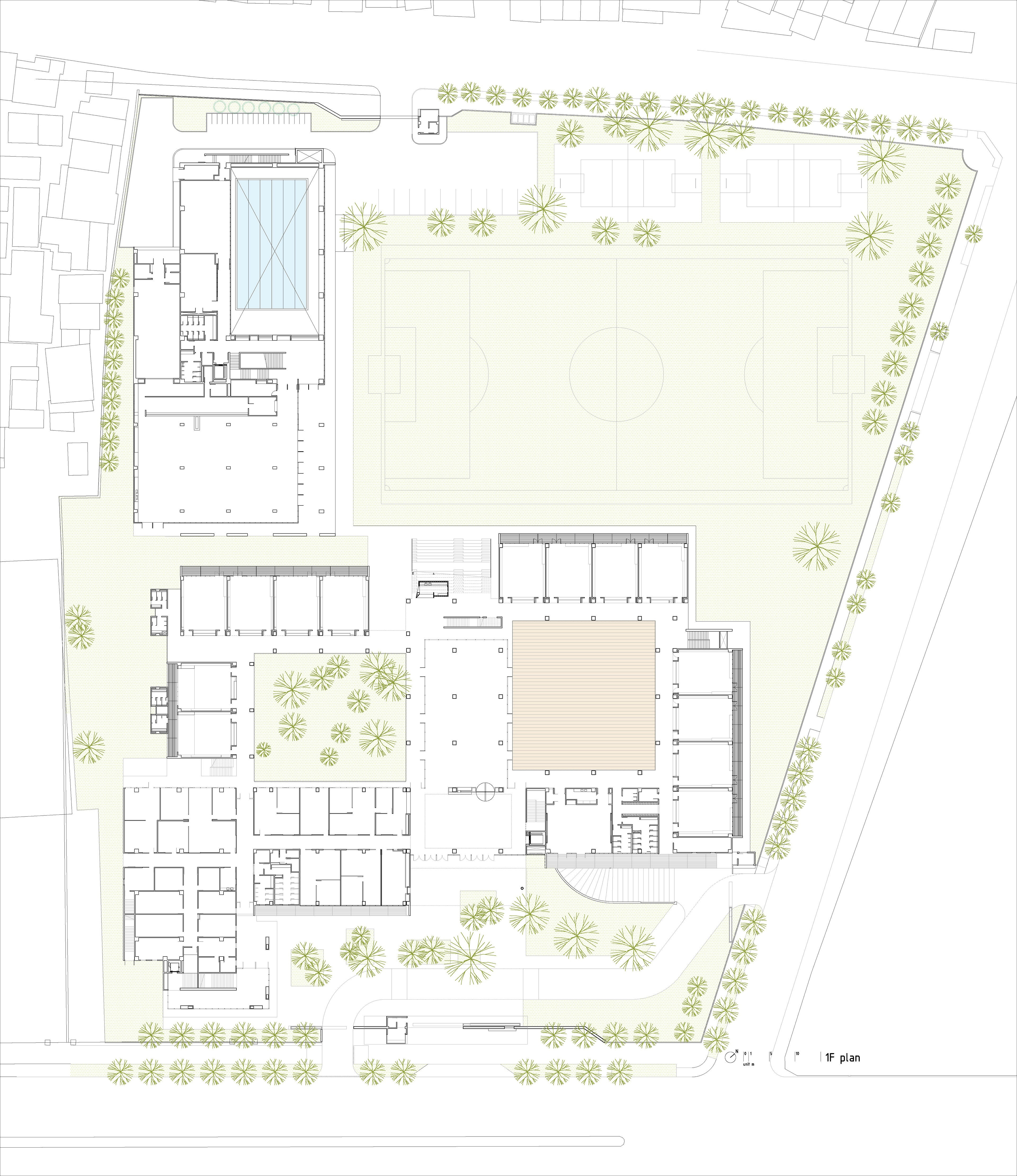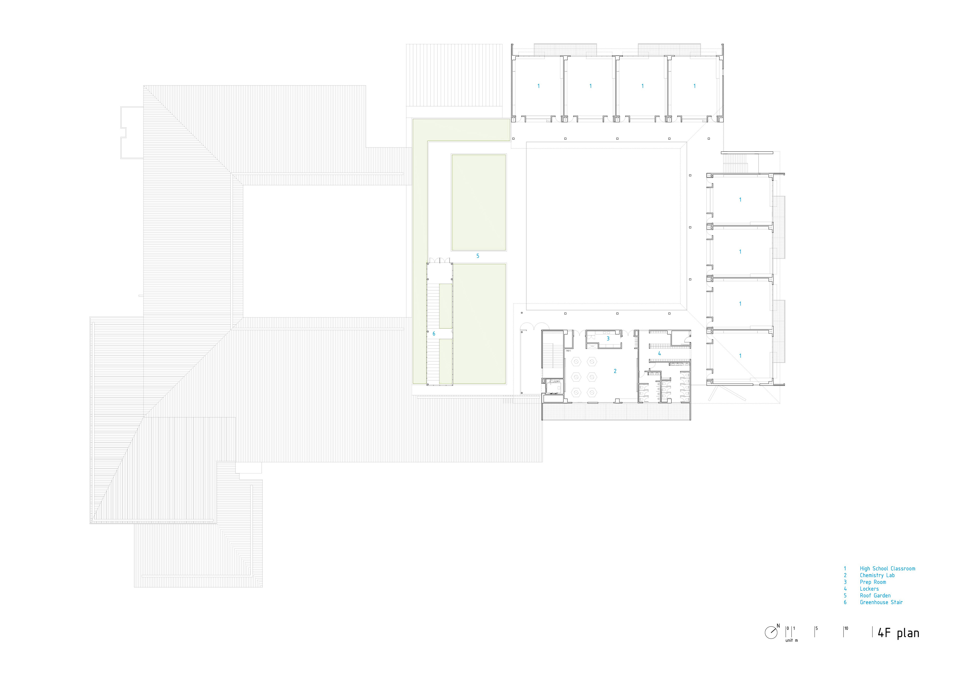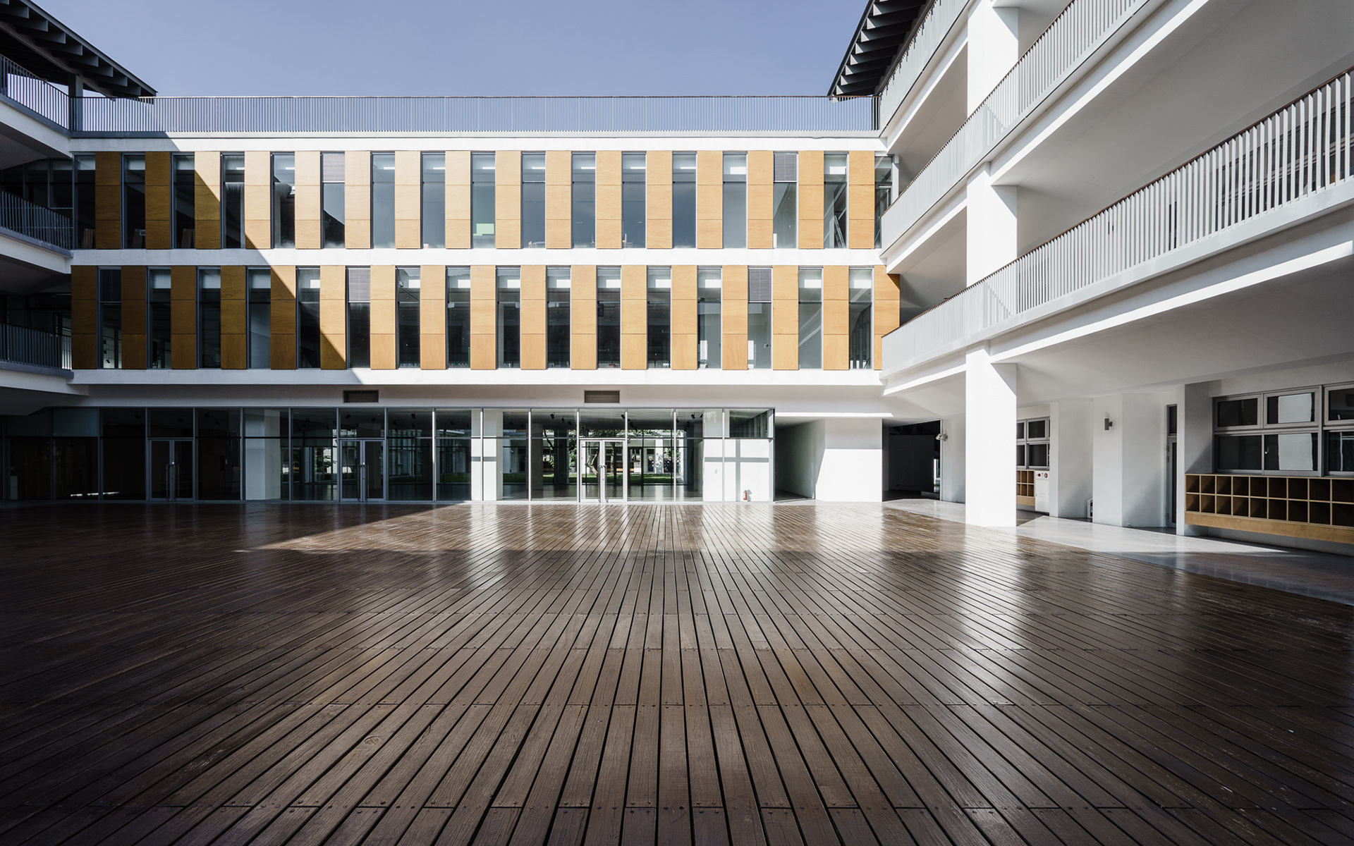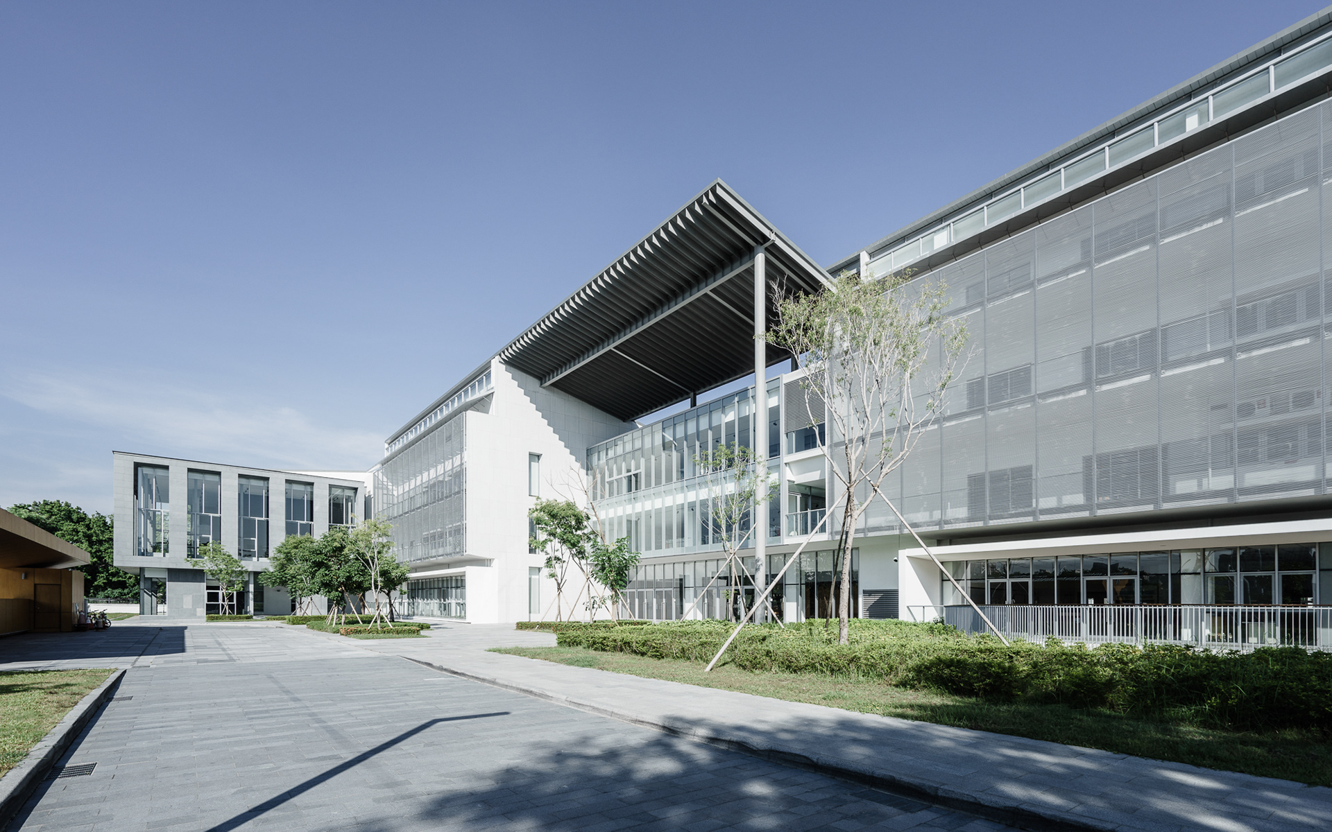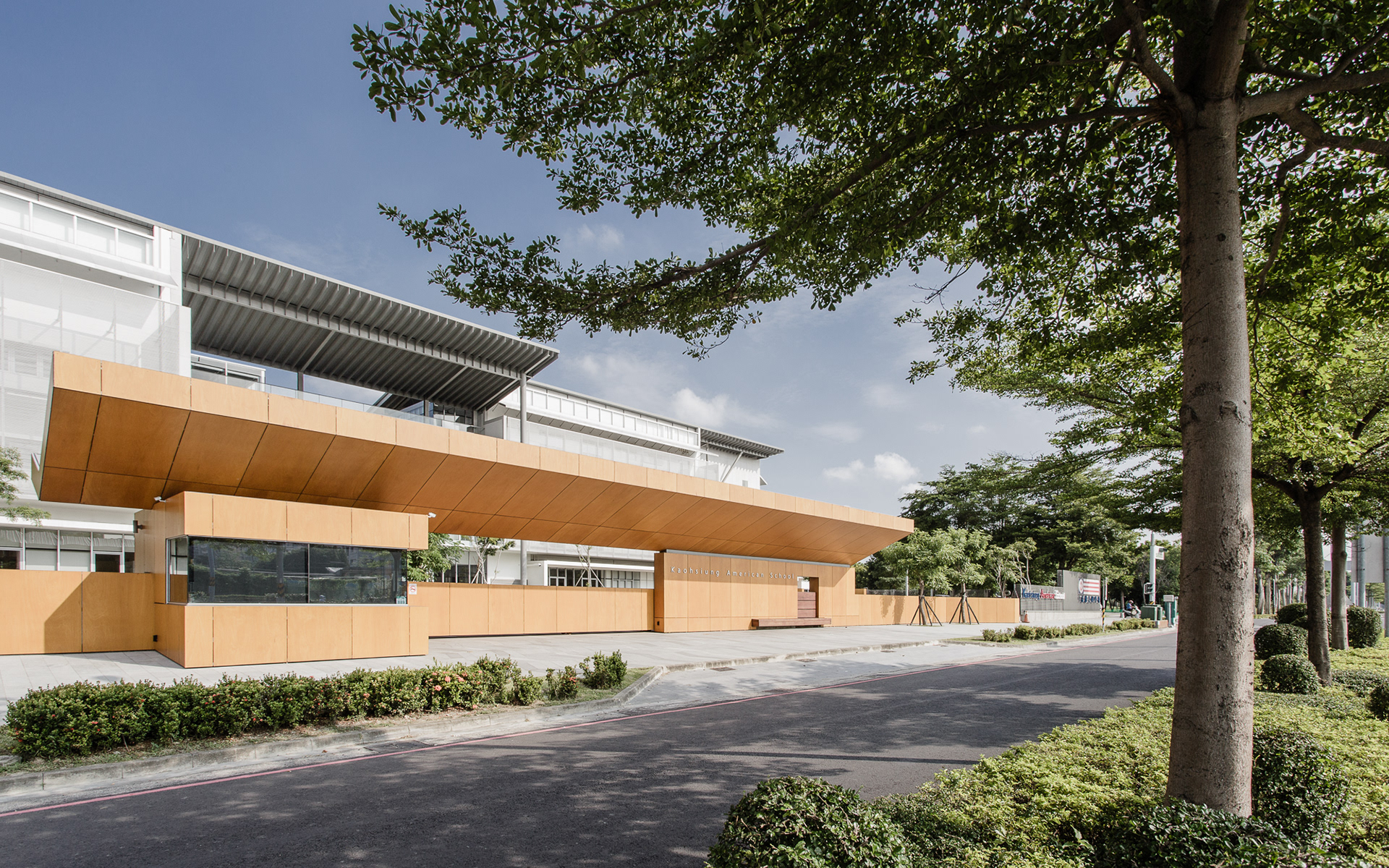 Quadrangle is a spatial typology often used in American higher education since the 19th century. In Taiwanese vernacular architecture, “quad” is where a clan dwells. We unite the two cultural manifestations into one, where the traditional veranda of the Taiwanese vernacular can embody the grandeur of loggia, prevalent in the American university settings. The quad typology not only connects both cultures with inherited social references, but its semi-open corridors also avoid the energy intensiveness and the opaqueness of a totally enclosed building so that teachers as well as students are always in touch with the sun, wind and light of the surrounding natural environment. The elementary school quad oriented toward the west surrounds a grassy yard, anchored by a group of preserved trees while the middle school/high school quad surrounds a large wood platform.