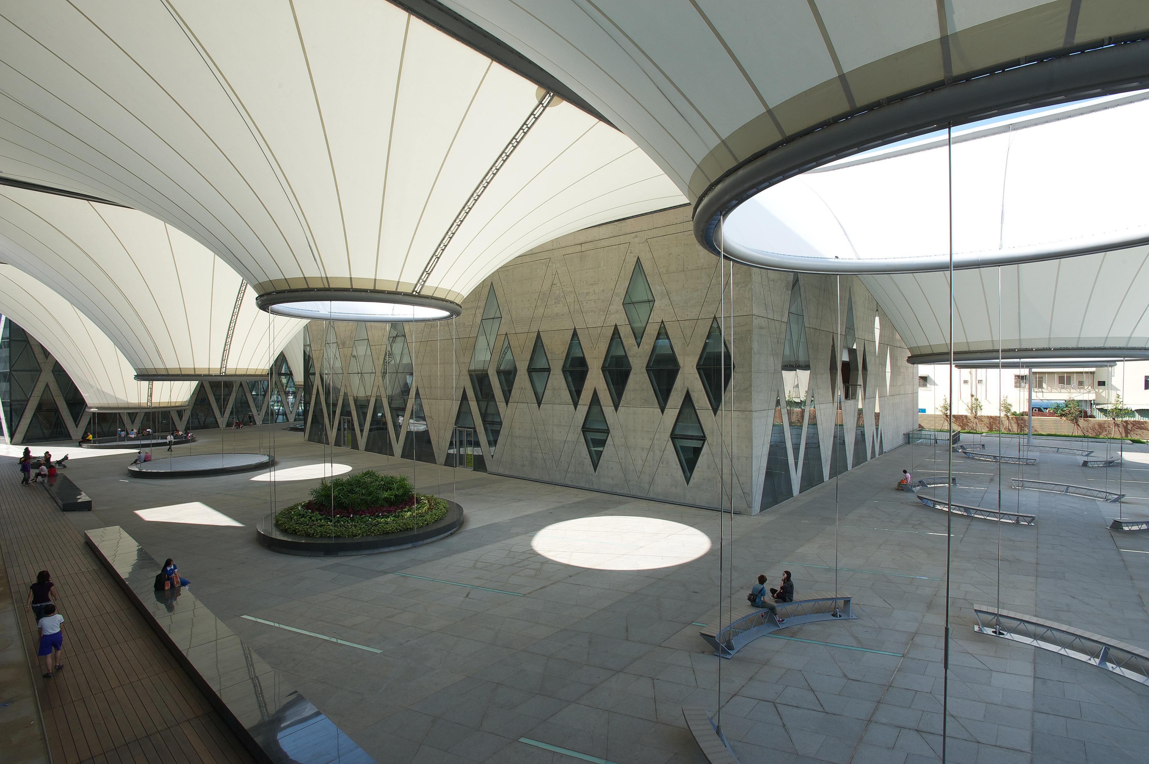 Da-dong Arts Center is located in Kaohsiung, the economic center of southern Taiwan. Connecting the dense context of historic Feng-Shan city, a major park, and the Feng-Shan River, the Arts Center creates a sequence of public spaces by means of membrane-covered interstitial open space between three major volumes- theater, exhibition hall, and the art education center.