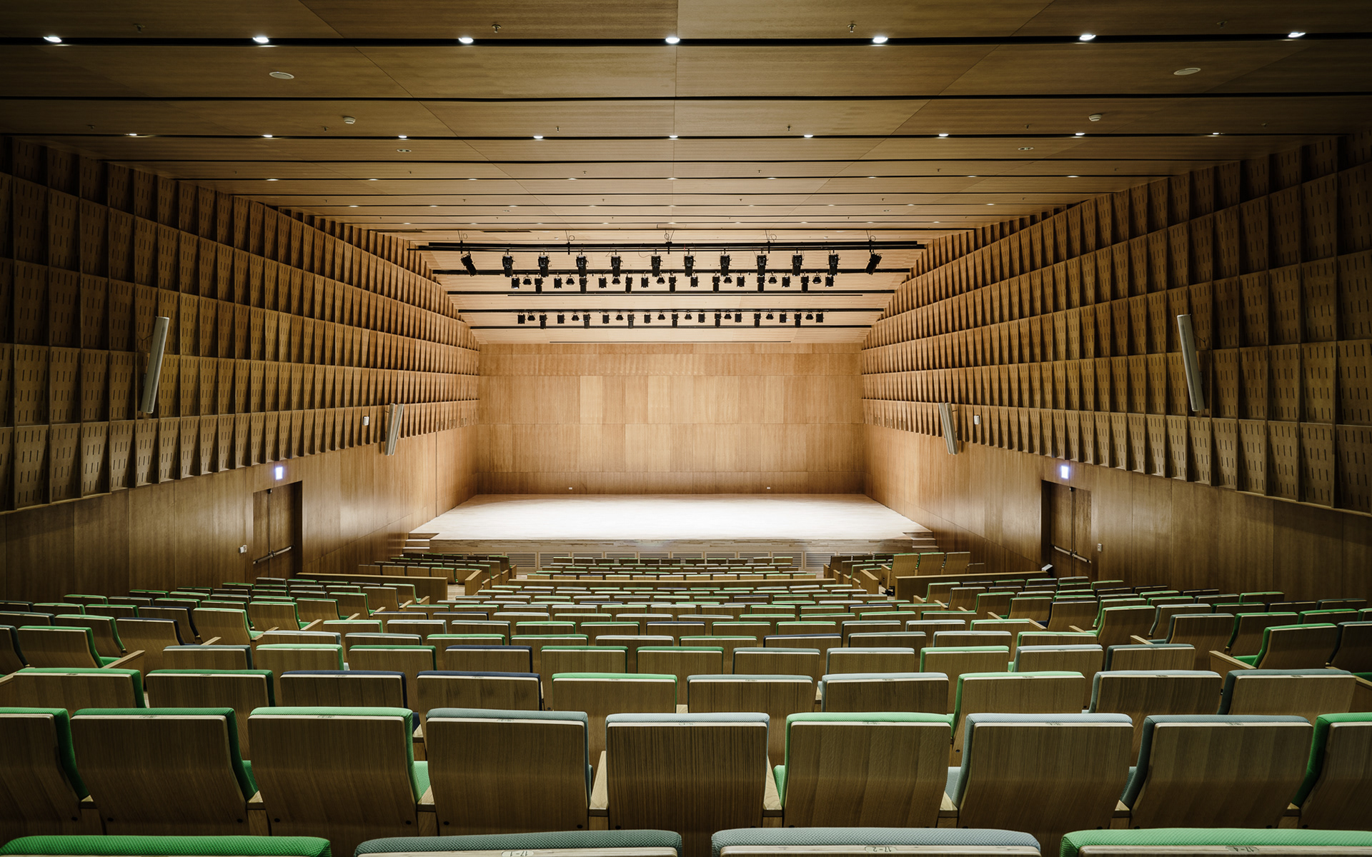 The shoe box shaped auditorium can seat 400 people. When students need to rehearse, a large sliding door can be used to extend the back stage area to include the adjacent music classrooms. This also allows music classrooms to become auxiliary backstage spaces to support larger productions. The sound-absorbing curtains are recessed behind acoustic wood panels on both sides of the auditorium. For theater productions and lectures, these curtains can be closed to absorb sounds in order to provide clarity of the sound broadcasting from the stage. For concerts, these curtains can be opened to increase reverberation time in order to generate good sound quality.