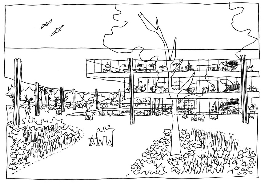 The result is a large canopy that provides shade to the transparent stepped facade and below-grade courtyards. Around the perimeter of the Lower Ground Floor is an outdoor children’s play area. A floor-to-ceiling glazed wall creates a visual connection between the play area and indoor children’s reading room.