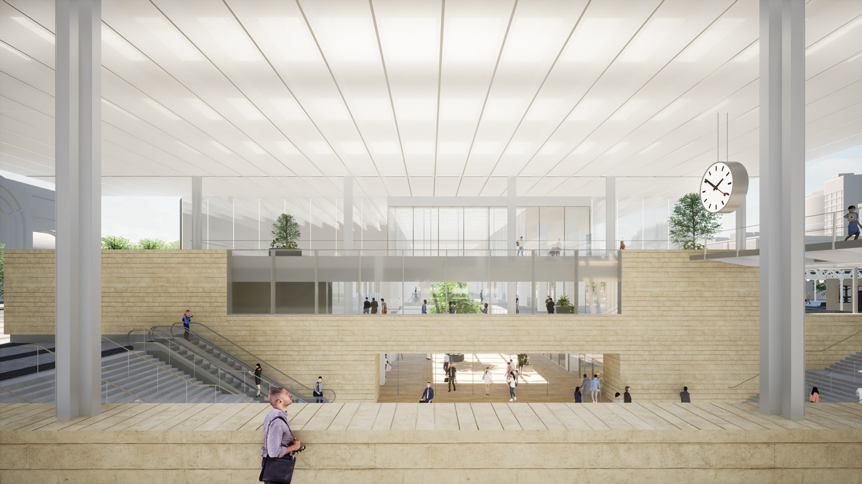臺南車站東側新站體將古蹟車站作為場域核心,整體配置架構可視為古蹟車站「品」字型格局之放大版。第一月台及中央廣場作為車站連結南北及東西向軸線之交匯點,維持原有的繁忙機能,並透過下沉廣場創造多元的遊逛動線,緊密結合地下化後的月台設施及地面上的旅運、商業機能。中央廣場寬度呼應古蹟車站東側立面拱圈,搭配挑高12公尺的大跨距屋頂過濾烈陽,將半戶外空間以古蹟車站作為背景轉化為如同美術館般的都市場域。橫跨南北量體的空橋輕巧的劃過天際,使旅客在遊逛中得以接近古蹟,由不同角度充分感受現代建築語彙與歷史風華的對話。