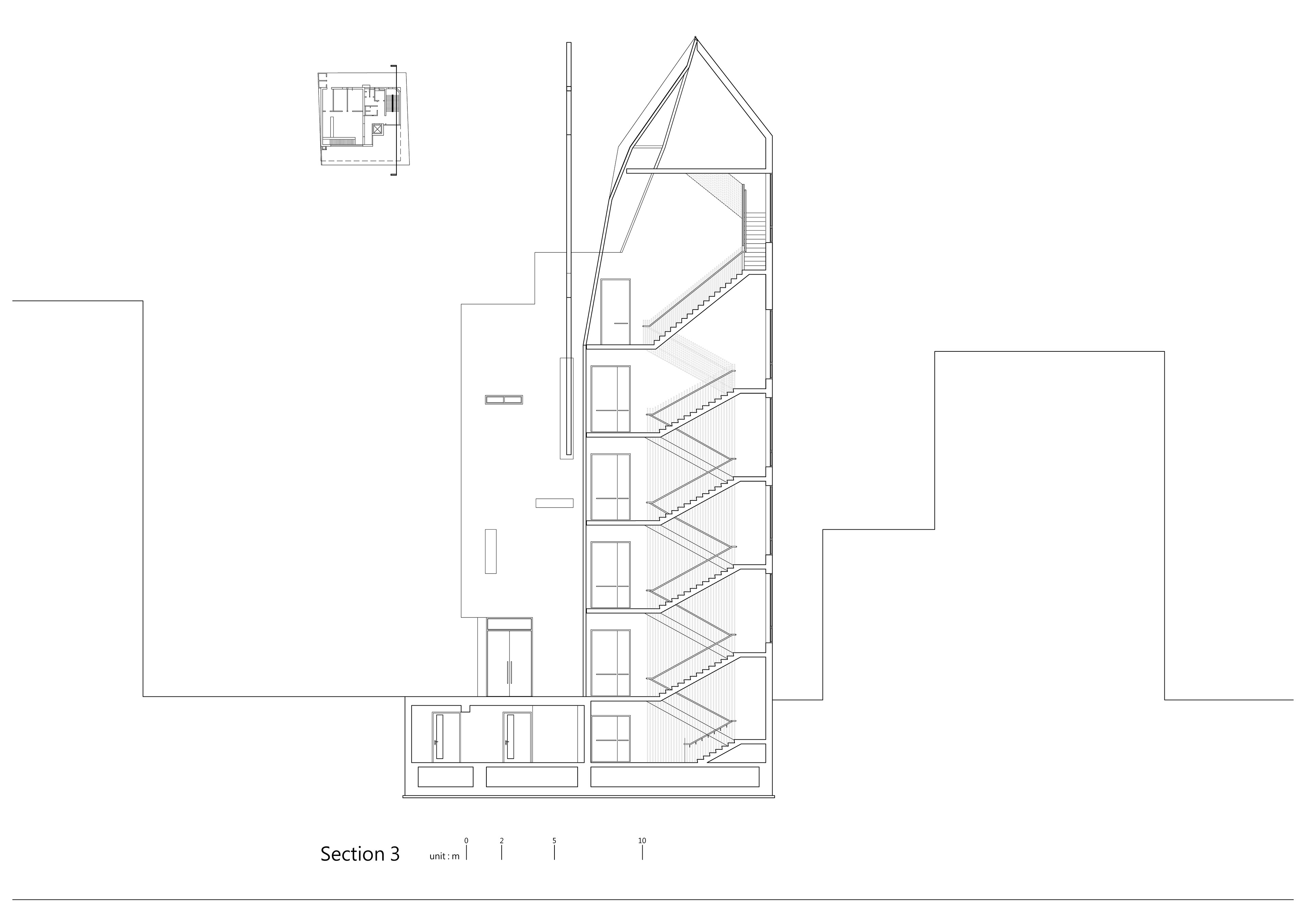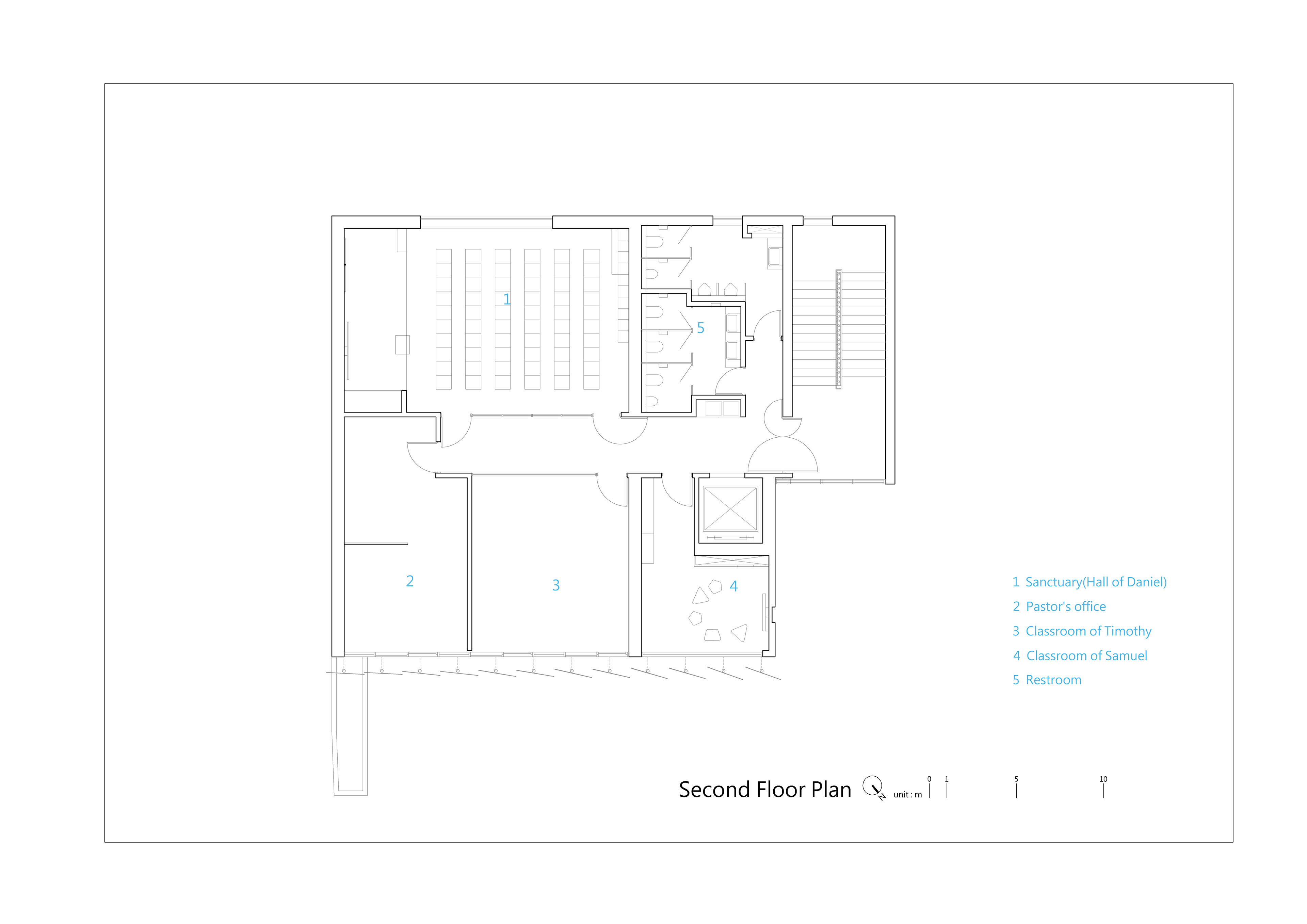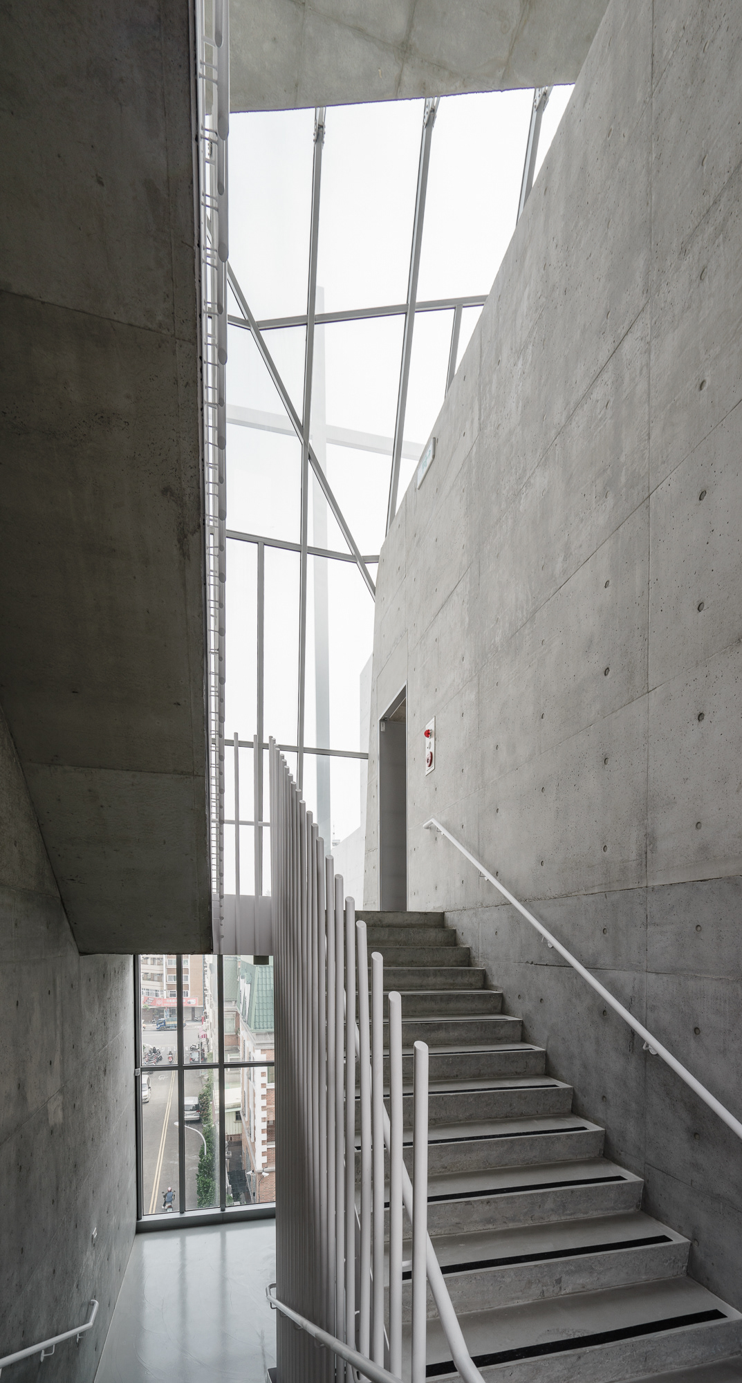 The site of the new church is surrounded by secular residential buildings. Responding to this contextual city fabric as well as the pastor’s vision, the lower floors of the church are used as socializing spaces such as coffee shop and family-friendly book store, inviting the community in and knitting the church closely with the life of the neighborhood. On the other hand, the dematerializing, white staircase leading to the sanctuary above transforms the spatial characteristic from the mundane to sanctified space by guiding the act of rising and turning through spilled natural light.