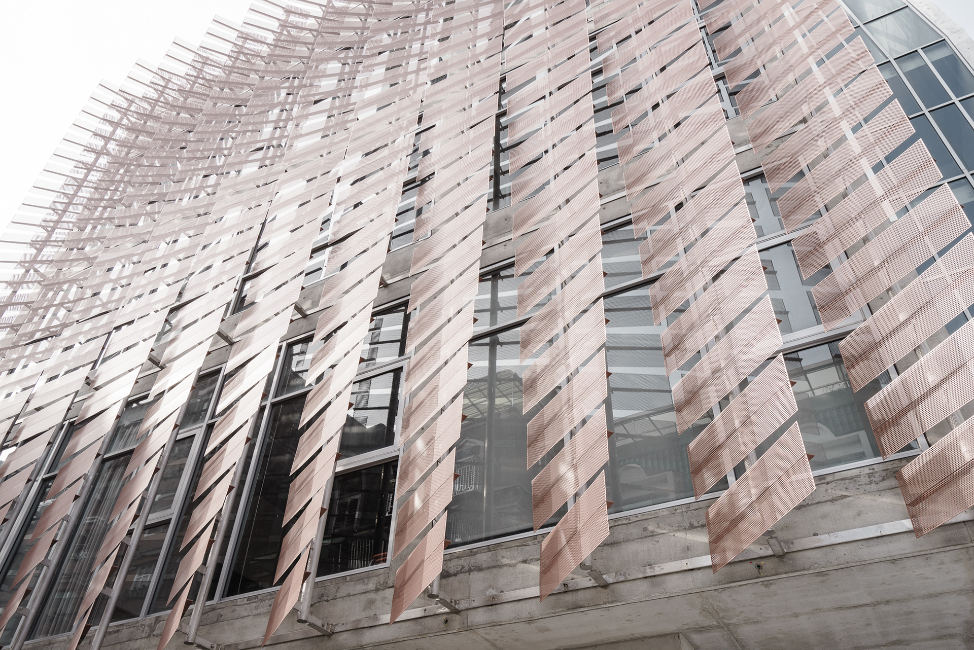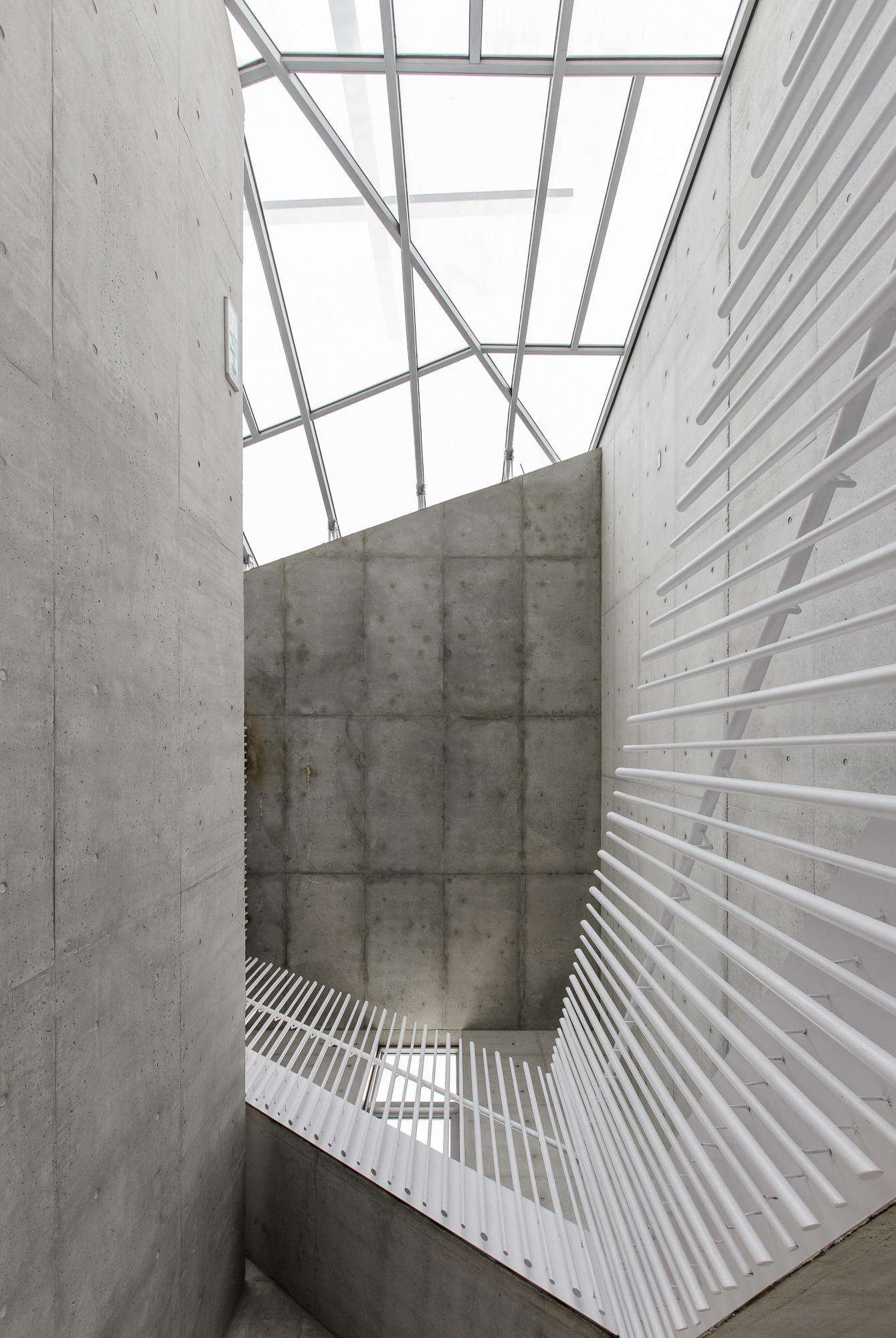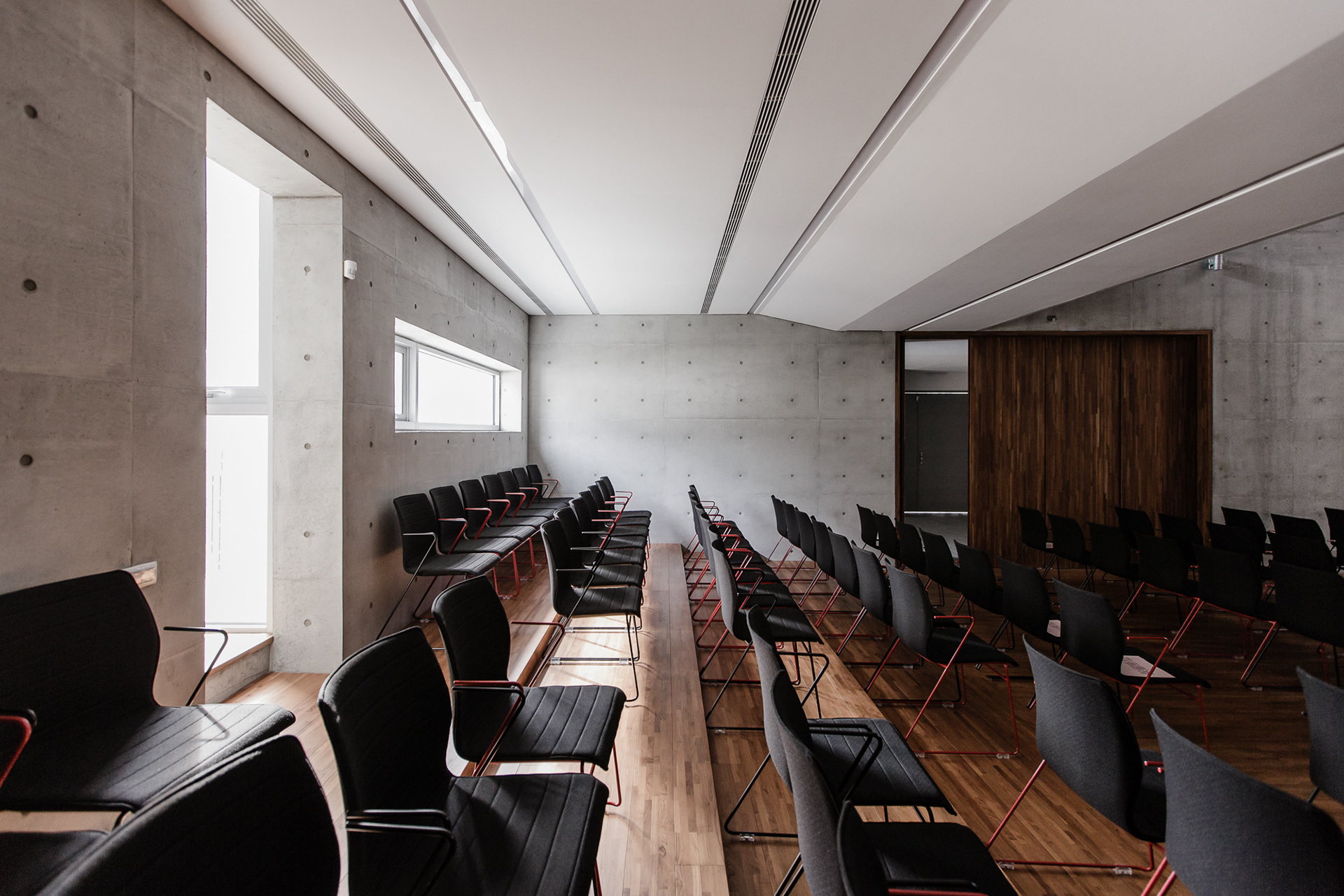 The church is mainly composed of cool architectural concrete but balanced with warm wood and copper colors used for curved sanctuary ceiling, oak staircase and feather-like metal screens on the main facade.