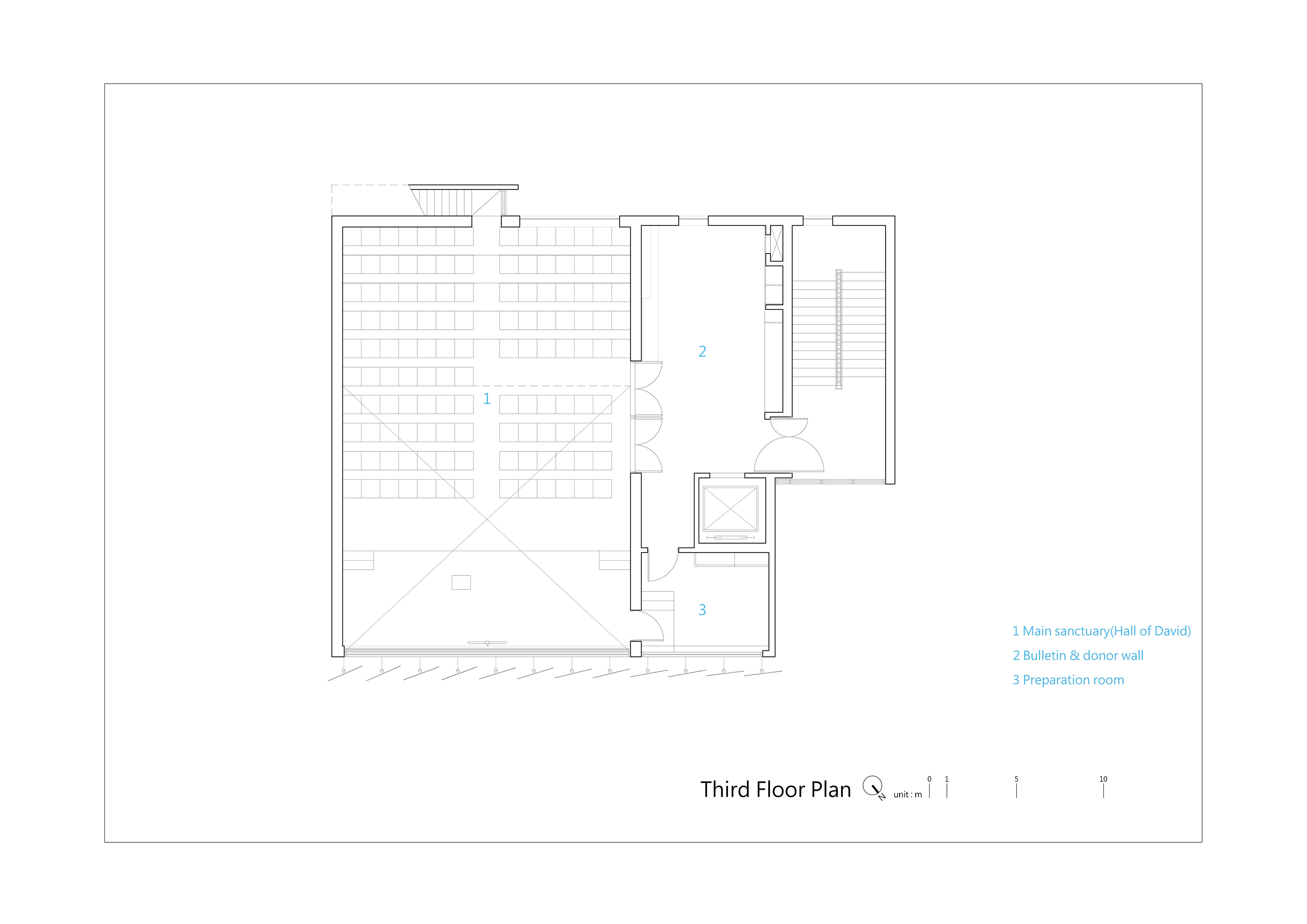 Where the sanctuary signifies as the holy space to worship God, it is a raised two-story cubical volume formed by cast-in-place architectural concrete and illuminated by soft and sacred light filtered through the aluminum perforated screens on the church exterior. A cantilevered wood staircase at the back of the sanctuary takes the user through the sky figuratively before connecting back into the sanctuary mezzanine. The user has a different visual experience at the open mezzanine and the adjacent nursery looking back into the sanctuary. The white vertical staircase terminates at church’s top floor, which consists three separate pray rooms. The user standing at the top landing of the staircase looks out onto the prominent white cross rising above the spandrel glass in close distance to the glass exterior of the stairway.
